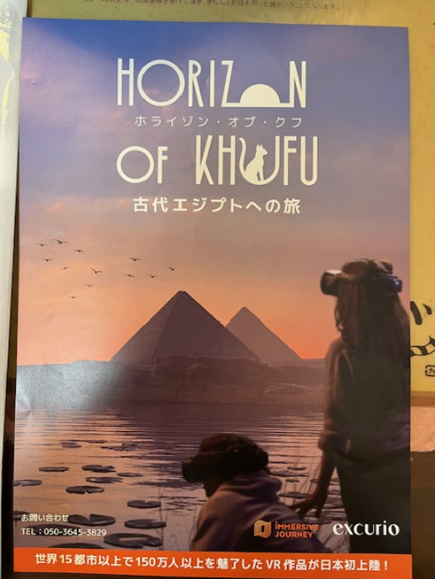 予約した14時半にVR(バーチャルリアリティー)を体験できる「イマーシブ・ジャーニー」の施設に行き、説明をいろいろ受けて、荷物をコインロッカーに入れ、電気が両側上に点いたトンネルみたいな廊下の先に入ると、ゴーグルを装着するように指示され、そこからはクフ王の時代のエジプトのピラミッドの中に入っていきます。ガイド役の外国人の女性(アバター)がいて、案内してくれます。下はボコボコしたような石のブロックの床なので、緊張して、足を一歩一歩運びました。しかし、これは視覚的な映像の錯覚であって、実はビルの中の何もない平面の床なのですが、視覚に引きずられ、現実とは違う感覚を味わいます。ディズニーランドの乗り物でも同じように、錯覚を利用したものはありますが、もっとリアルな体験をします。360度、エジプトの景色が広がっています。猫も出てくるのですが、毛がフサフサで、触ると柔らかそうですが、「触らない、近寄らない」というルールがあるので、見ているだけでした。また、椅子なども、そこにあって、まるで座れそうなのですが、これも見ているだけ。ピラミッドの上に登り、外の全景を眺めるのですが、高所恐怖の私には高さで恐怖心が出てしまいました。没入体験というか、とてもイメージの世界に入り込んでしまう性質が自分にはあることを改めて認識しました。友人はジェットコースターも平気な人なので、「どうせ、平面なんだと思って、落ちないから平気」と割り切れたとのこと。違いに驚かされました。私にとっては近年まれに見る、15分の説明の時間を含めた約1時間のすごい体験でした。また、別のメニューを是非体験してみたいです。是非、みなさんにお薦めしたいです。